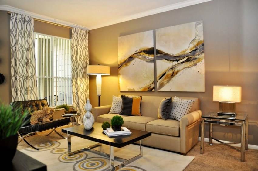 Приглушенные тона стен гостиной хорошо разбавит картина в авангардистском стиле