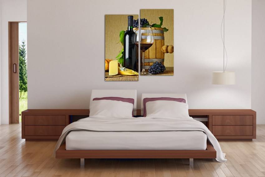 Если в зале можно разместить практически любое изображение, на кухне — милые натюрморты или миниатюры, то для спальни выбор усложняется: яркие постеры перед глазами будут мешать уснуть, картины с мелкими деталями заставят пересчитать «облака перед сном», а крупные элементы будут раздражающе влиять на психику. Пастельные тона, спокойный сюжет, средние размеры — это идеальная картина для украшения спальни.