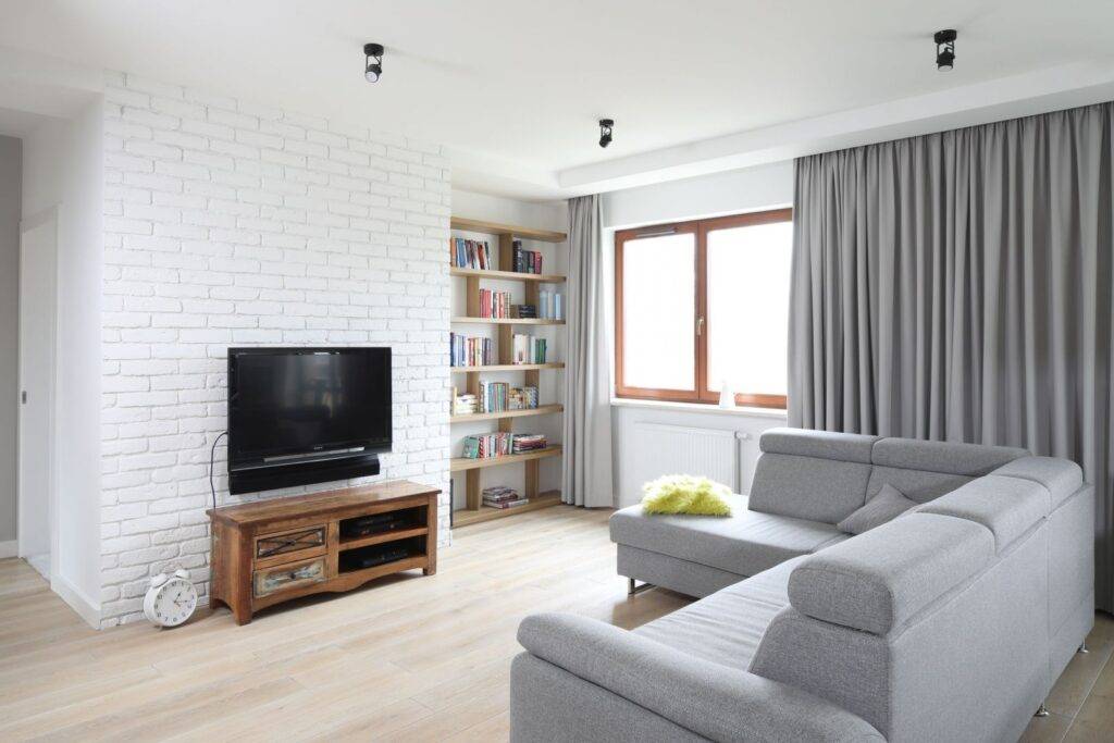 Белый кирпич — прекрасное решение для скандинавского дизайна. Светлое покрытие стен хорошо сочетается с серой мягкой мебелью и деревянным полом. На одной из стен нужно использовать белый кирпич, а остальные покрасить краской нежного оттенка, например серым.
