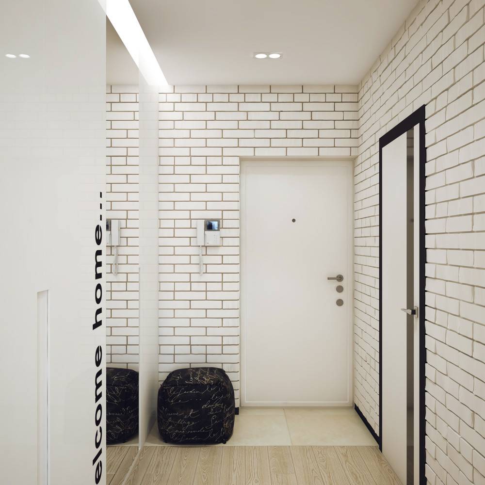 На фото кирпичная стена в прихожей в интерьере студии 56 кв. м.