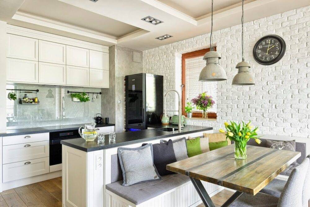 Также в кухне можно выделить кладкой обеденную зону, барную стойку, стол-остров.