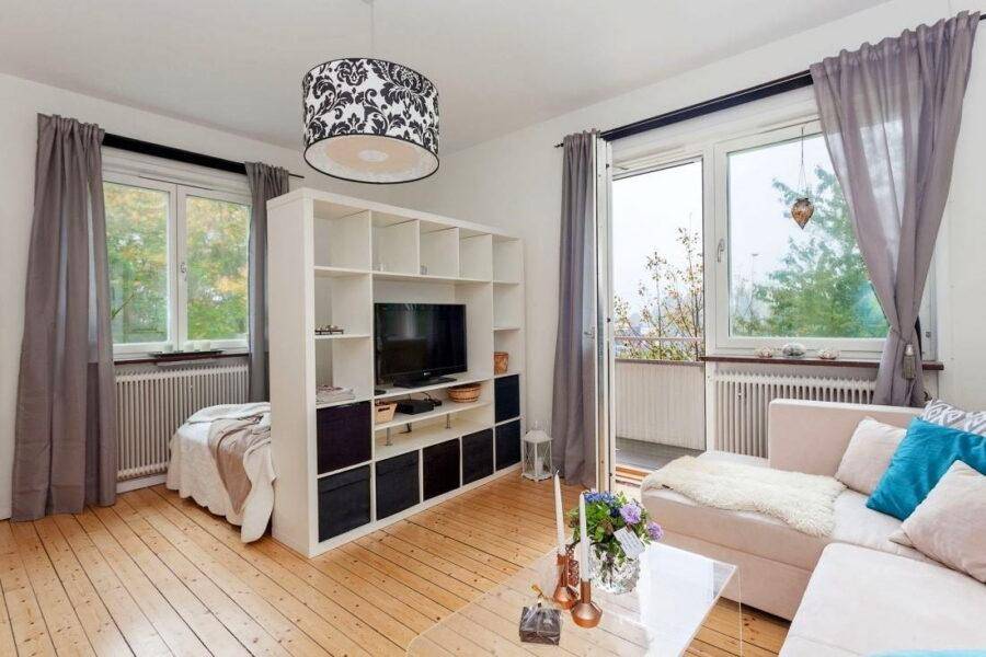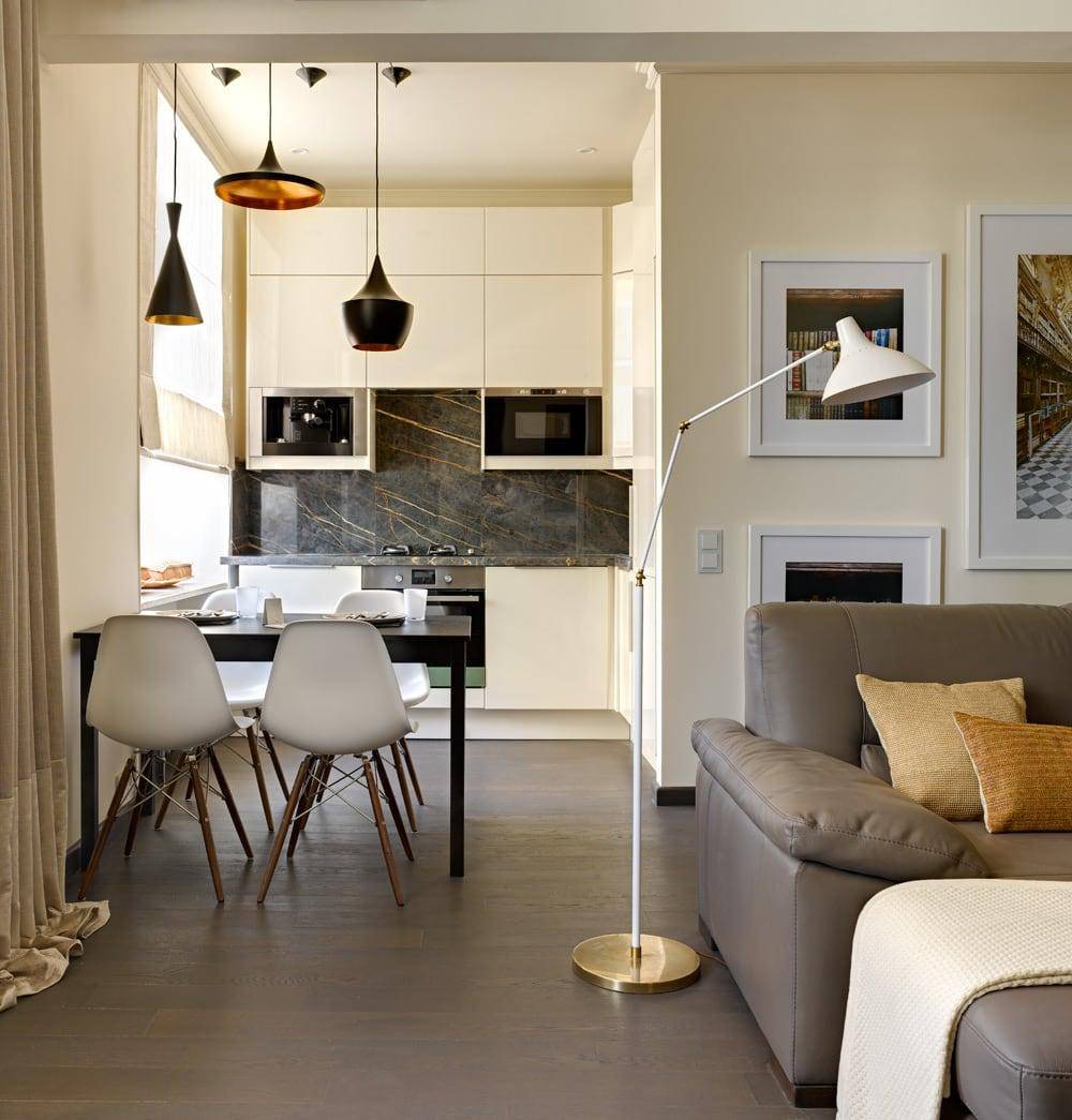 Для однокомнатных квартир решением может стать создание квартиры-студии – когда сносят все перегородки и объединяют комнату с кухней и прихожей. Последнюю чаще всего отделяют от гостиной мебелью или условным декором. Чтобы выделить кухню и отделить ее от жилой зоны, можно приподнять пол или использовать отличительное от комнаты напольное покрытие.