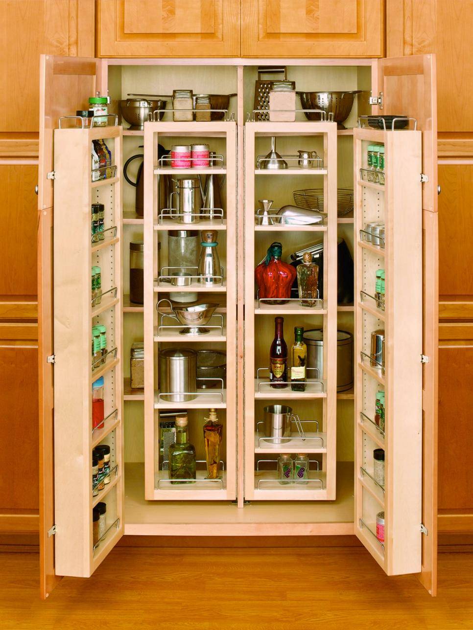 Многие хозяйки закупают продукты впрок, делают соленья и варенья на зиму, запасаются мешками сахара и муки. Все это можно расположить в кладовой. Для экономии пространства при хранении однотипных продуктов сделайте глубокие выдвижные полки. Система хранения круп должна быть оснащена съемной тарой, которую легко взять с собой на кухню во время приготовления еды.