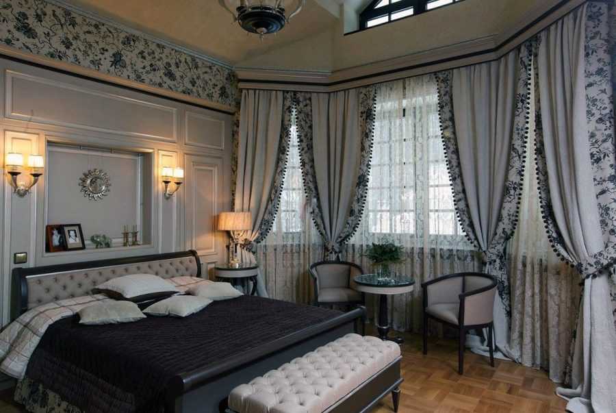 Оформление окон традиционное для этого стиля, тяжёлые портьеры с ламбрекенами и драпировками. Зачастую их подвязывают, создавая более пышное оформление. Не менее традиционное и освещение — люстра по центру потолка и боковые встроенные или настенные светильники.