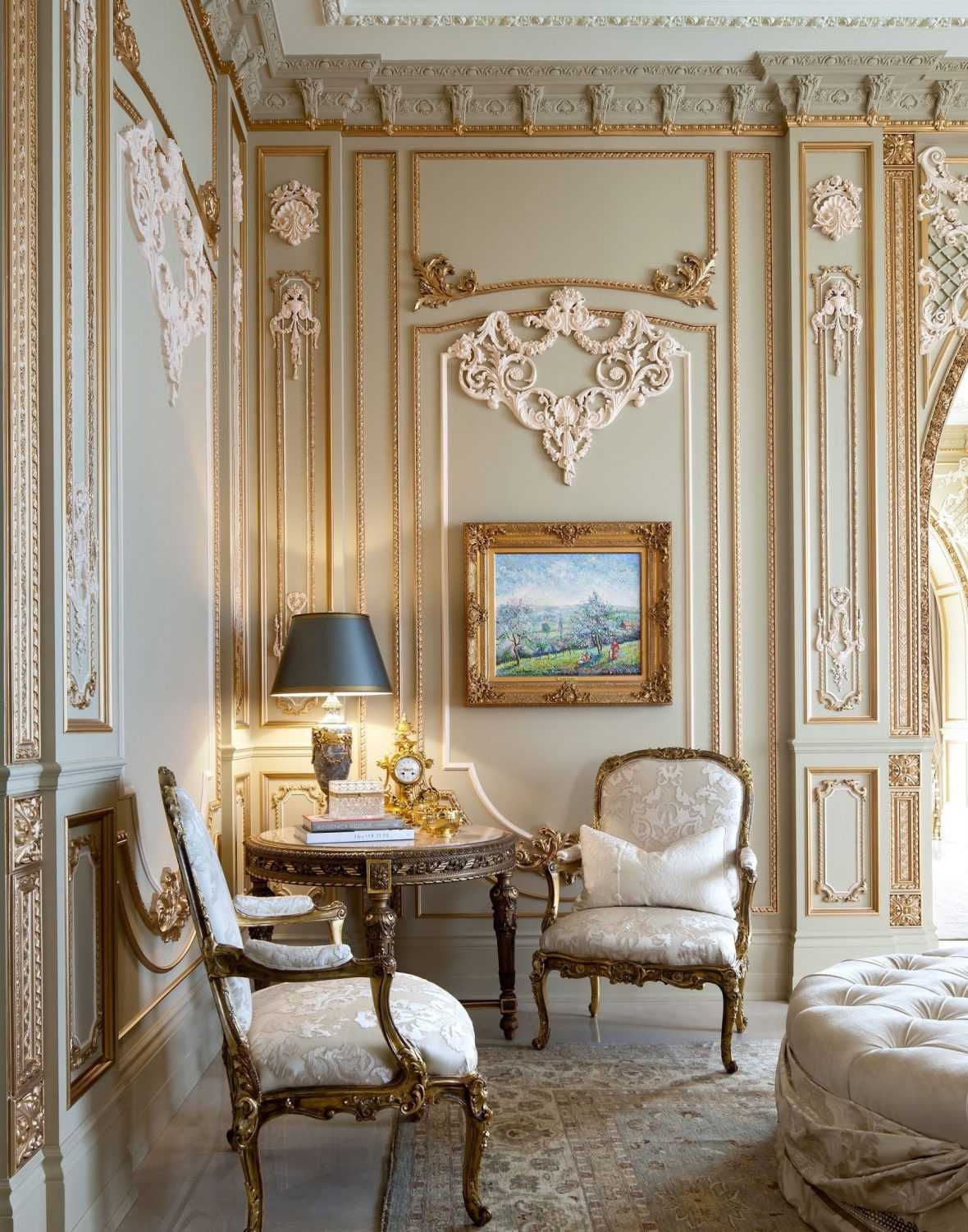 Но если паркет, то не с геометрической выкладкой, а со сложными фигурами. Стены — окрашенные, отделанные декоративной штукатуркой или оклеенные обоями с характерным рисунком, напоминающем вензеля.
