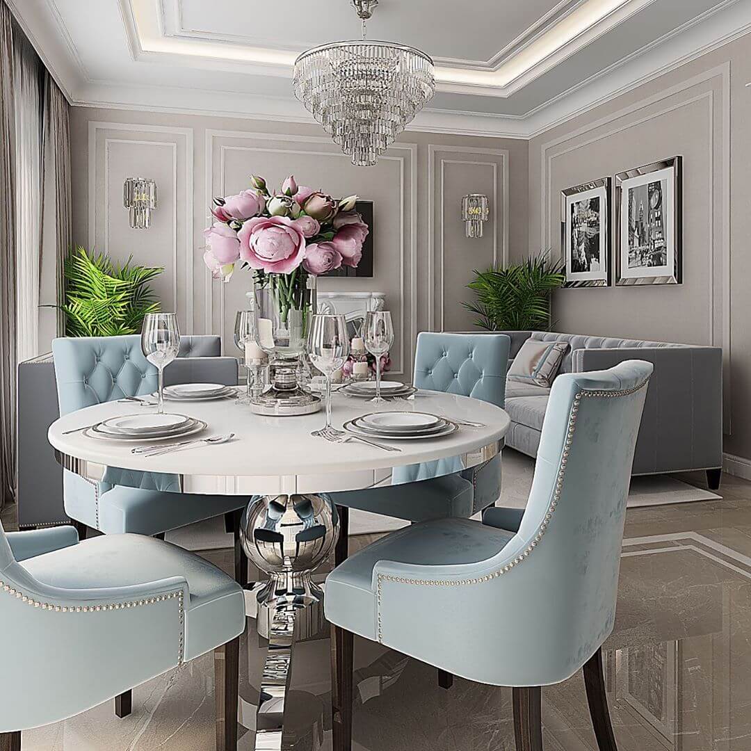 В гостиной должен обязательно присутствовать крупный комод, а обеденную зону следует оформить крупным столом и стульями. От табуретов следует отказаться. Их заменяют на изысканные стулья с мягкими подлокотниками, сиденьями, спинками.
