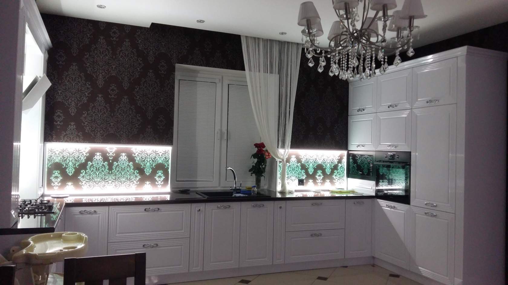 На кухне в классическом интерьере обязательно должен присутствовать один основной мощный источник света. Чаще всего это массивная люстра, расположенная прямо над обеденным столом.