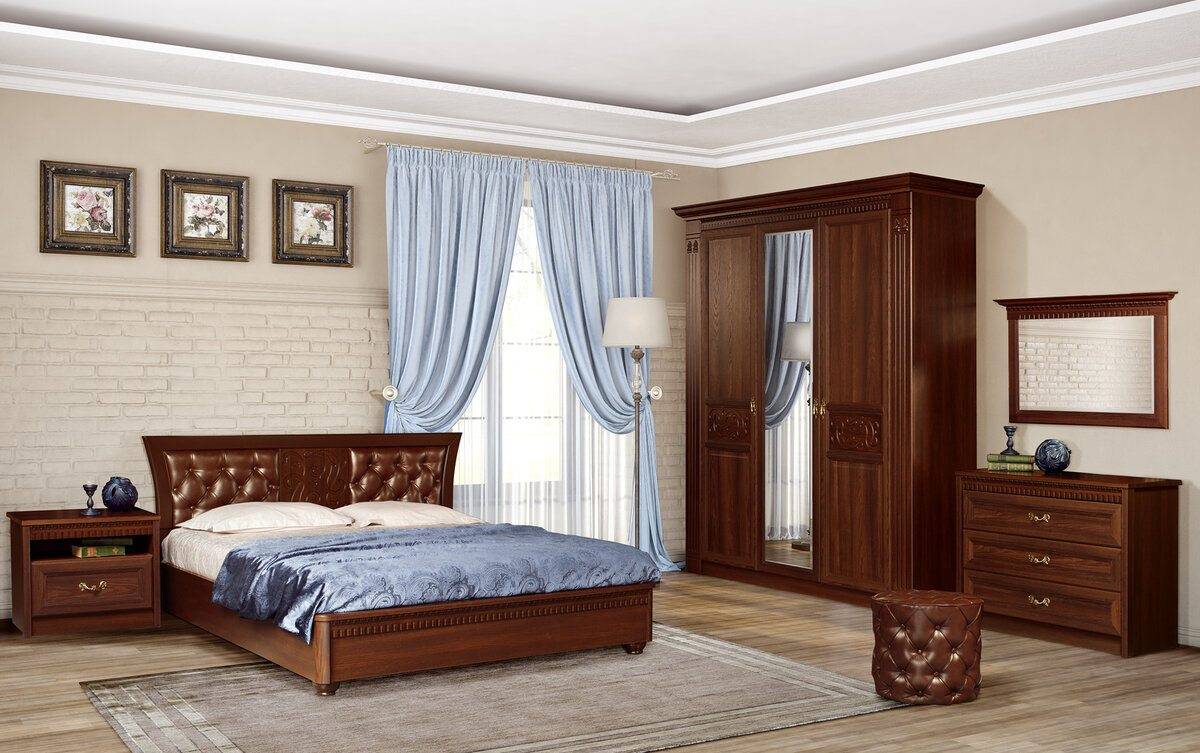 Классическая узкая спальня с интересным оформлениемИсточник comfortoria.ru