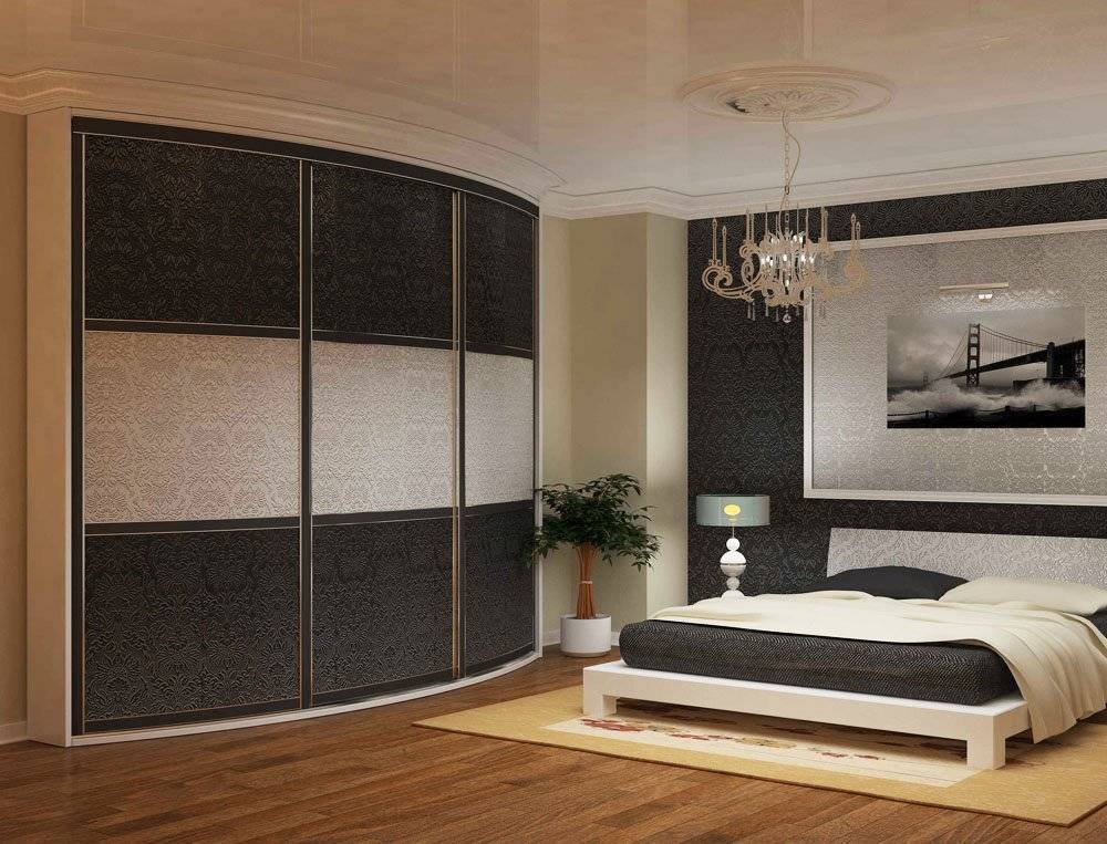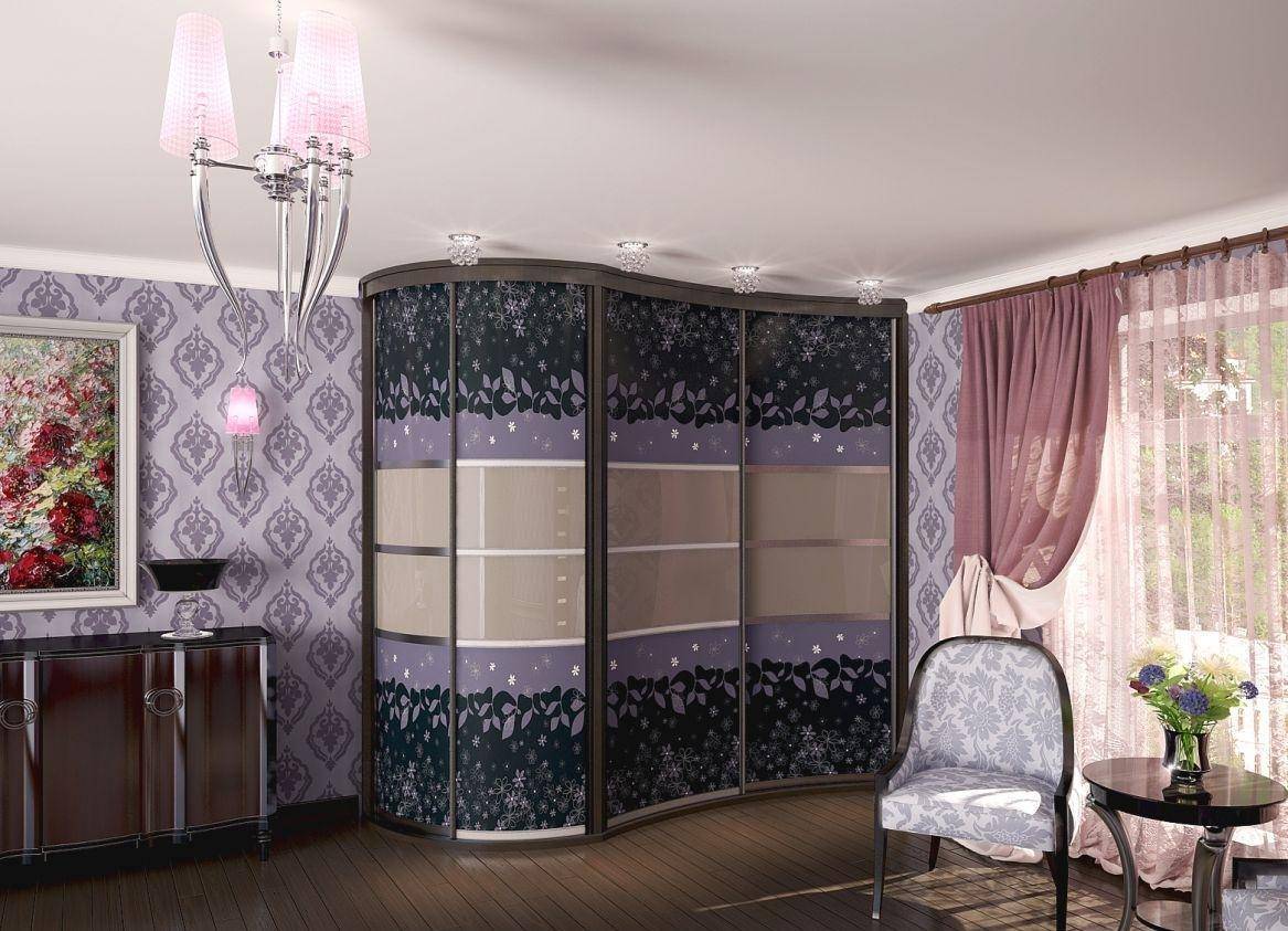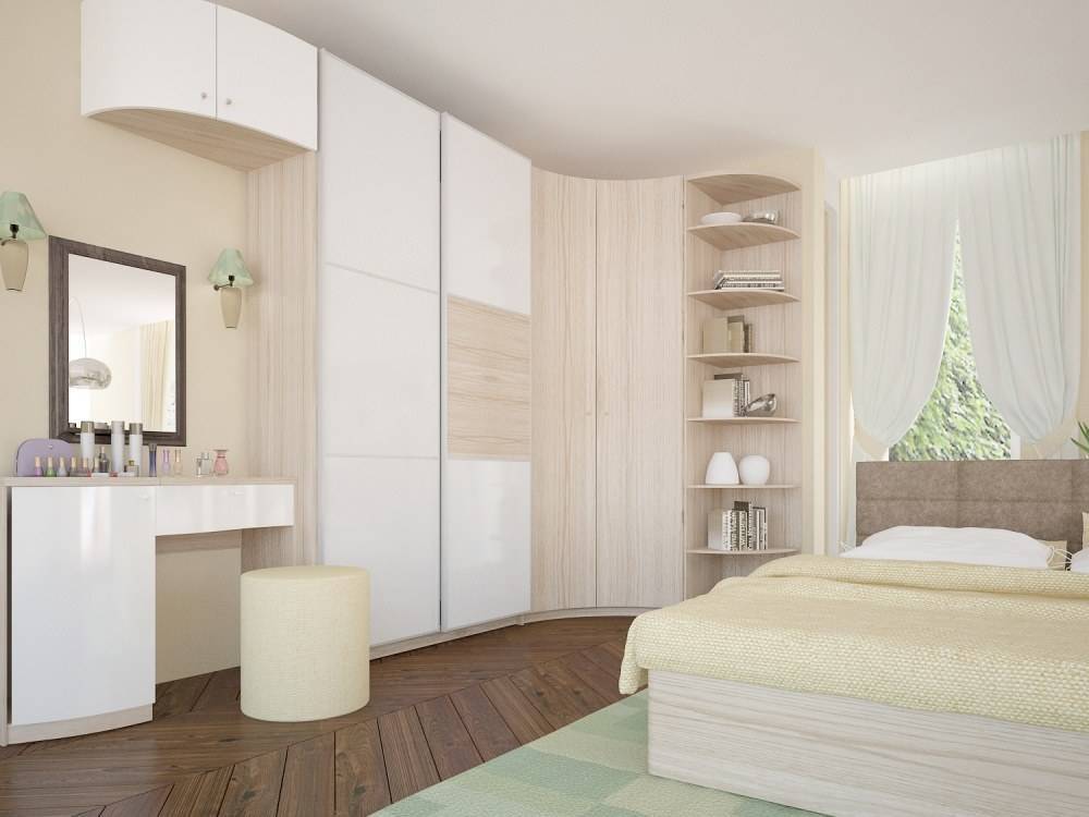 Радиусный. Подразделяется на вогнутые модели и выпуклые. Первые ненавязчиво создают дополнительный объем. По сути, служат модификацией треугольных шкафов. Вторые обыгрывают Г-образные силуэты. Мягкие линии хорошо вписываются в модерн, хай-тек, романтизм, эклектика.