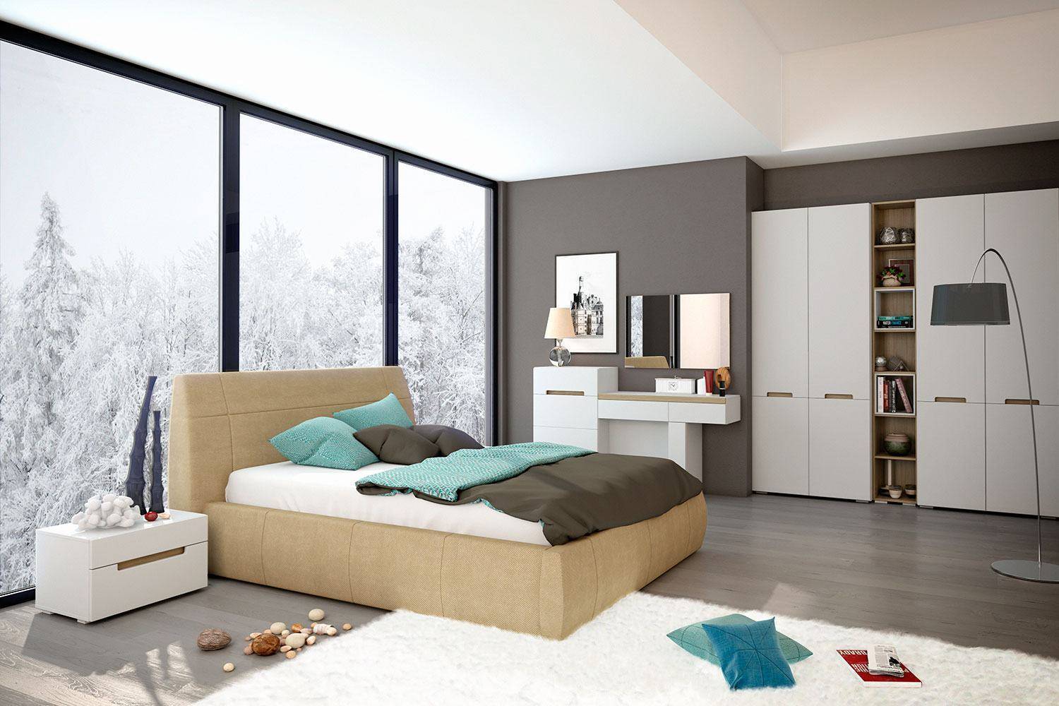Г-образный. Две прямоугольные секции соединяются под прямым углом. Максимально вместительный вариант, который к тому же очень бережно относится к квадратным сантиметрам вашей спальни. Подходит для малогабаритных комнат, где каждый миллиметр на счету.