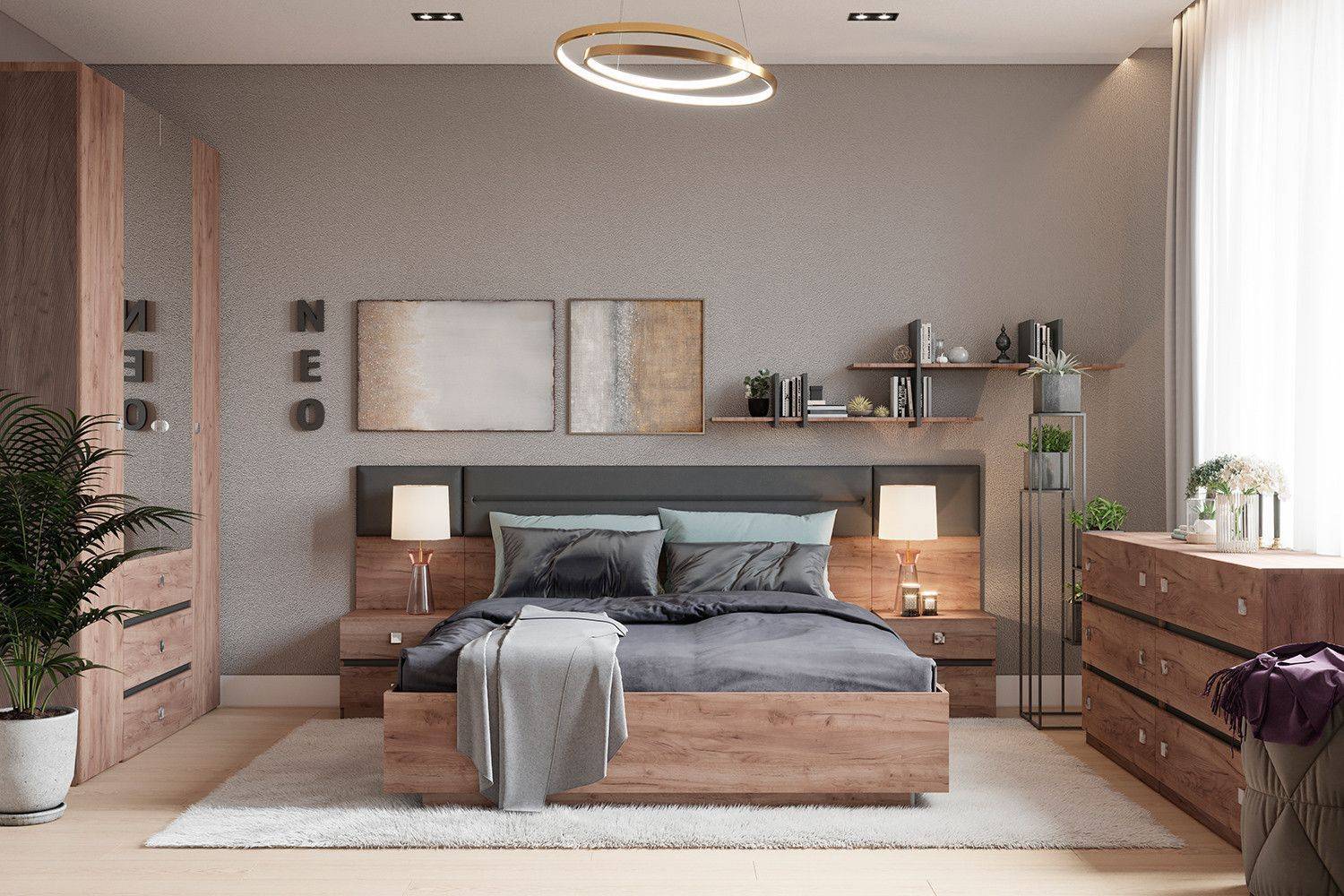 Современный интерьер отлично подходит для оформления малогабаритных спален. Для такого направления характерно применение фактурной мебели и интересных вариантов отделки: деревянных панелей для стен, паркета, грубых покрытий.