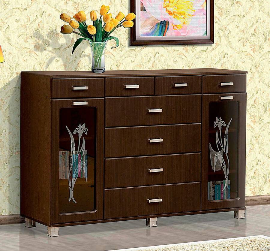 - Не менее интересны и практичны изделия из МДФ. Этот материал превосходно имитирует фактуру и рисунок дерева и обладает важным дополнительным достоинством. Он практически нечувствителен к действию влаги и температуры, со временем не рассыхается и не меняет формы. Дизайнерские комоды в гостиную нередко выполняются из МДФ.