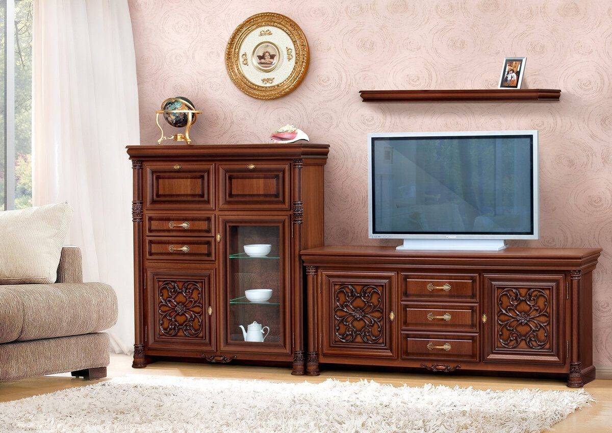 Для ценителей классики прекрасным выбором станут изысканные комоды под ТВ, изготовленные из массива. При этом фасад должен быть украшен багетами, молдингами и красивой резьбой. Несмотря на то что подобные модели выглядят слишком массивно, они способны придать дизайну шик. На верхней полочке комода удобно разместится техника, а по боковым стеллажам можно расставить комнатные растения, вазы и прочие предметы декора.