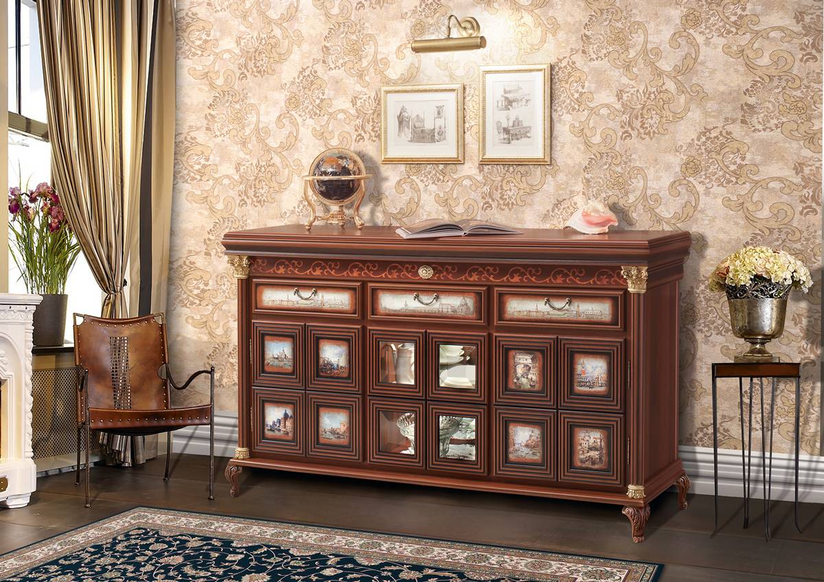 Классические комоды для нарядной гостиной обязательно украшаются резьбой, богатым молдингом. Как правило, материалом для них служит дерево с красивым ярким древесным рисунком. При этом дерево полируется или вскрывается лаком. В неоклассике комод может быть окрашен в нейтральный или пастельный цвет. Предпочтение отдается матовой краске.