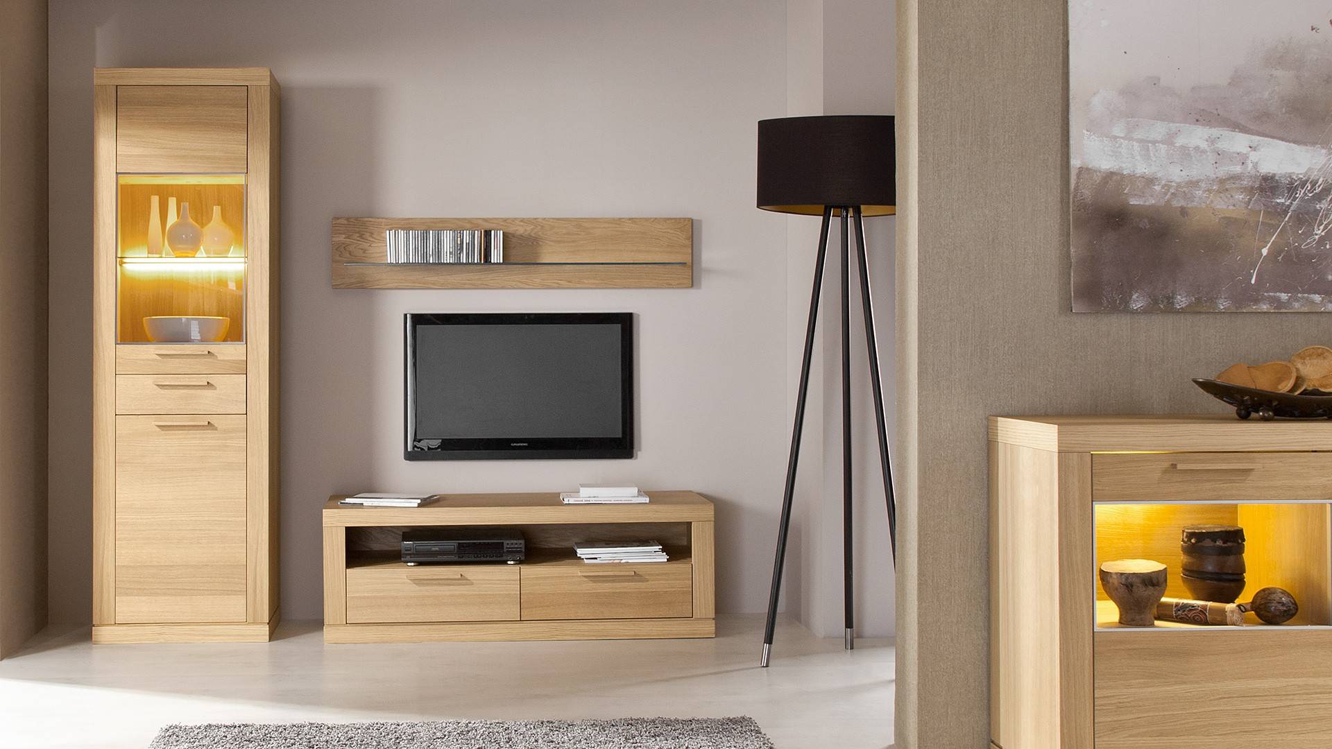 Для гостиной в современных минималистских стилях характерно такое сочетание комода, стенки, телевизионной стойки, которое образует единое целое, как на демонстрируемом фото. Материалом служит окрашенное дерево или дерево с неярким, слабым рисунком.