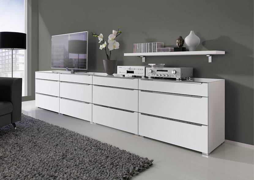Низкие длинные тумбы, изначально предназначенные только для хранения, станут отличным решением и для установки ТВ-панели;