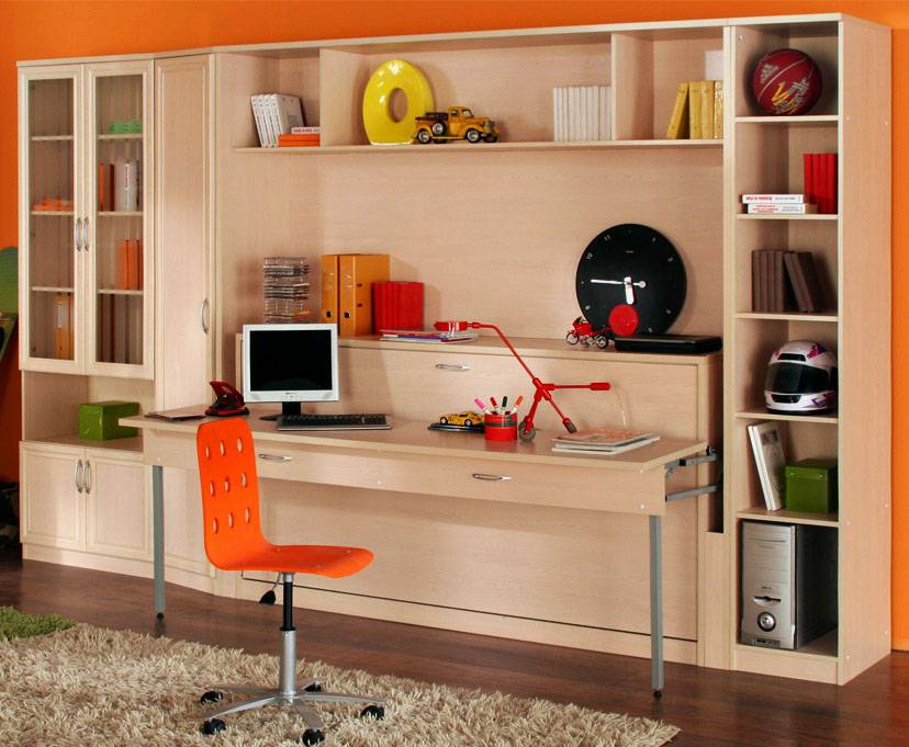 Отчетливый пример: откидная кровать со столом. Днем ложе ставится вертикально и смотрится как обыкновенный шкаф. Перед тем как ложиться спать столешница со всем содержимым может подниматься или спускаться. Еще 1 вариант — конструкция, восполненная механизмом поворотного типа. С одной стороны размещаются полки, а со второй матрас с выдвижными ножками.