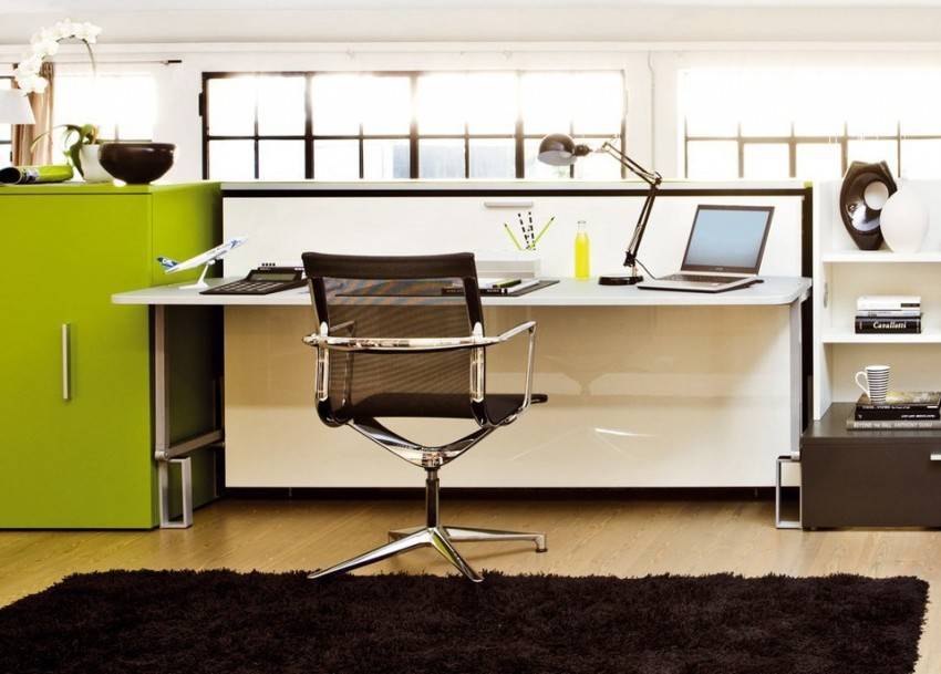 Комната, с убирающимся местом для сна, становится довольно свободной. Подобный подход дает возможность организовать настоящее место, как для работы, так и отдыха.