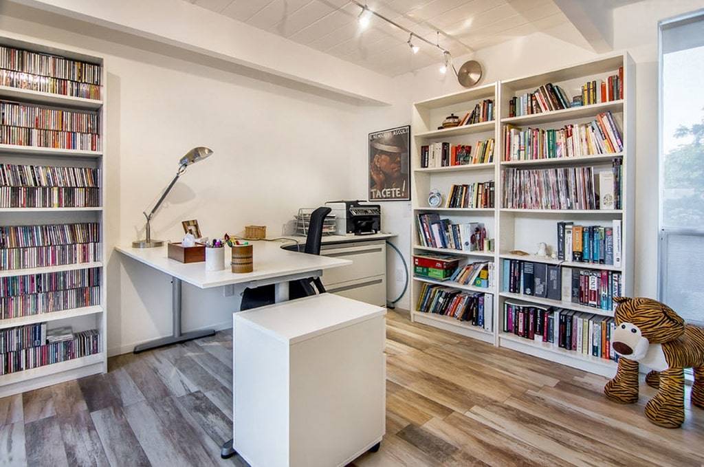 Основная идея для дизайна совмещенного рабочего уголка – это размещение открытых полок, которые уместны в любом направлении и стиле. Здесь лишь можно варьировать материалы и декор таковых. Например, в ультратехнологичной обстановке можно установить и металлические стеллажи, в других дизайнах это может быть и стекло, и древесина. Именно она используется чаще всего. Открытые полки удобны не только потому, что легко вписываются в разные интерьеры, но они и более эргономичны – сидя в кресле гораздо проще дотянуться до книги, учебника или папки, чем до дверцы, чтобы ее открыть и закрыть.