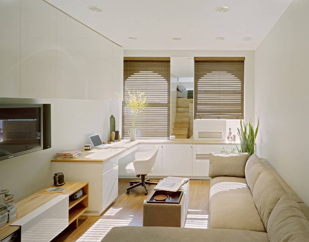 Гостиная с рабочим местом обычно оформляется в довольно ограниченном пространстве квартир с недостаточным количеством комнат, размер которых также не радует широкими возможностями. Поэтому речь, как правило, идет о довольно скромных интерьерах. Чаще всего это современная обстановка, подчиненная требованиям функциональности и комфорта. В совмещенном пространстве не стоит выбирать вычурные и ажурные направления, ведь здесь только декор отнимет немало места.