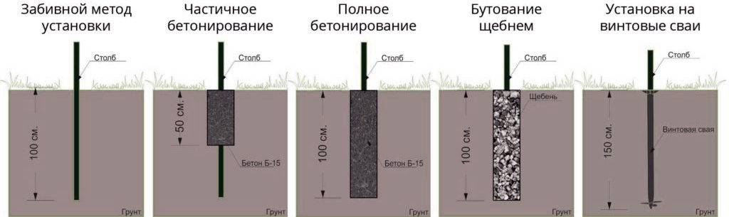 В месте установки опоры устраивается углубление, на дне которого отсыпается подушка из песка или щебня в 10-15 см. погружаемый конец опоры обрабатывается антикоррозийным составом (битумная мастика или другие). Столб устанавливается в углубление и бетонируется.
