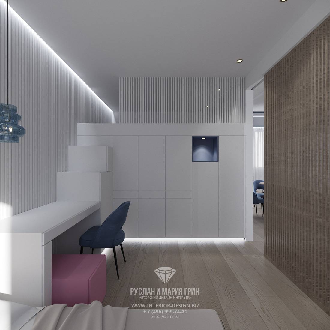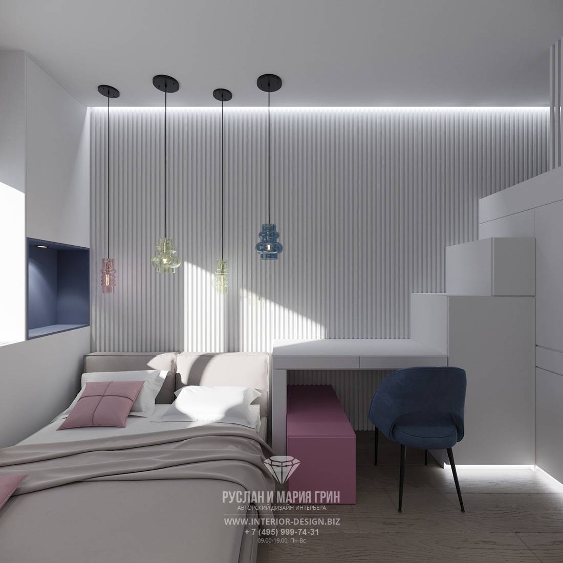 Проблема нехватки места в детской решается путём использования встроенных систем хранения со стильными белыми фасадами. В оконной зоне задействован каждый квадратный миллиметр, а ступенчатая конструкция справа от изголовья кровати одновременно служит рабочим столом, шкафом для игрушек и одежды, а также игровой площадкой.