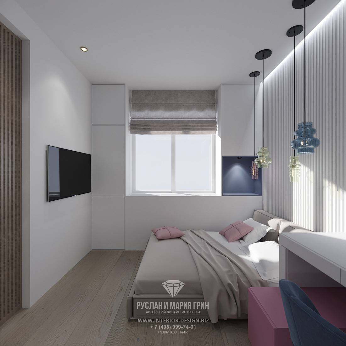 Напротив большой детской кровати удобно расположена ТВ-зона. В итоге, ребенку обеспечен простор, уют, место для сна, занятий и удовольствие от просмотра собственного телевизора.