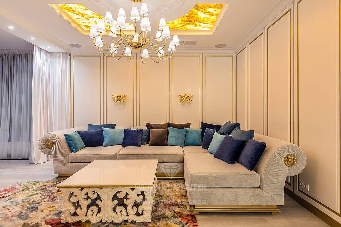 Натуральные пастельные тона, классические элементы декора (хрустальные люстры, лепнина) и природные материалы, соседствующие с современными. Яркая особенность — стеганая мебель из трикотажа капитоне и уютный камин.