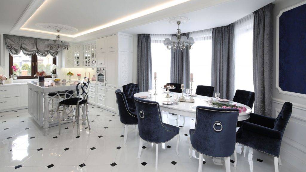 Если же кухонное помещение отличается достаточным количеством свободного пространства, то здесь можно установить габаритные гарнитуры и обеденный стол для всей семьи. Однако при этом необходимо учитывать тот факт, что должно остаться место для холодильника, плиты и другой бытовой техники.