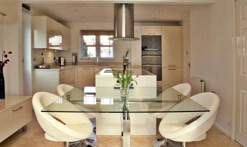 Если же кухонное помещение отличается достаточным количеством свободного пространства, то здесь можно установить габаритные гарнитуры и обеденный стол для всей семьи. Однако при этом необходимо учитывать тот факт, что должно остаться место для холодильника, плиты и другой бытовой техники.