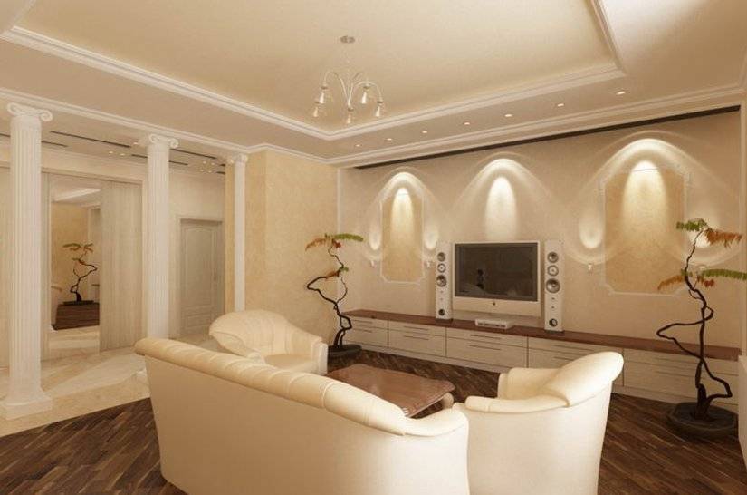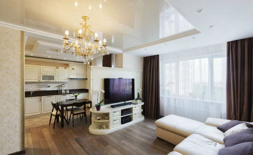Зонирование производят разнообразными методами, это комбинирование с помощью света, применение контрастных оттенков и натяжных (подвесных) потолков, различных по фактуре, расцветке и уровням.