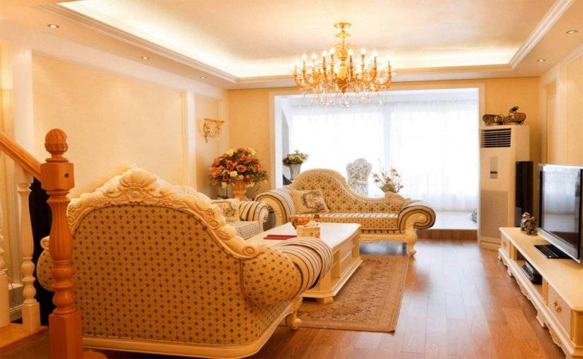 Натуральные пастельные тона, классические элементы декора (хрустальные люстры, лепнина) и природные материалы, соседствующие с современными. Яркая особенность — стеганая мебель из трикотажа капитоне и уютный камин.