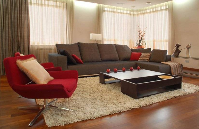 Подушки и шторы в цвет ковра уже не столь популярны, лучше использовать контрастные материалы, либо подходящие принты. А плед сегодня не стоит раскладывать по дивану, небрежно накинуть полотно на спинку дивана – вот что советуют дизайнеры.
