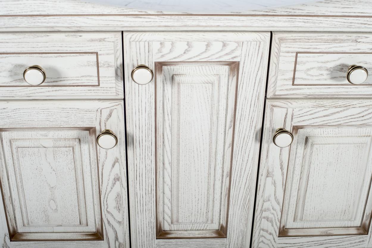 - Создание состаренного покрытия. Используются патинированный материал, который распределяется по шкафчику с помощью губки либо кисти. Далее шлифуют поверхность;