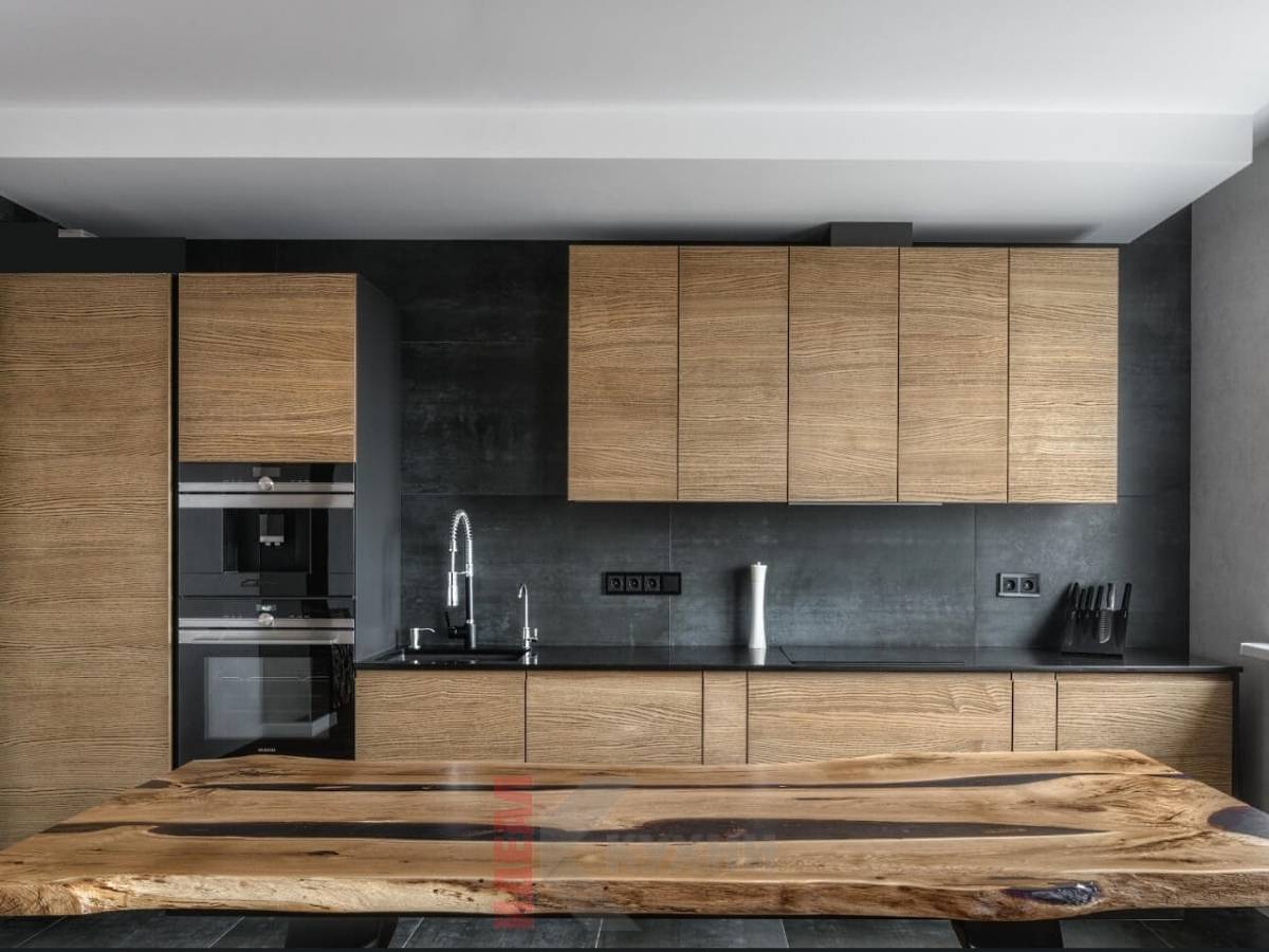 Структурная стена в зоне фартука в черном цвете создают визуальную глубину. Пространство кажется удлиненным и функциональным. Матовая отделка поверхности не отражает интерьер, поэтому подходит для кухонь с большой площадью.