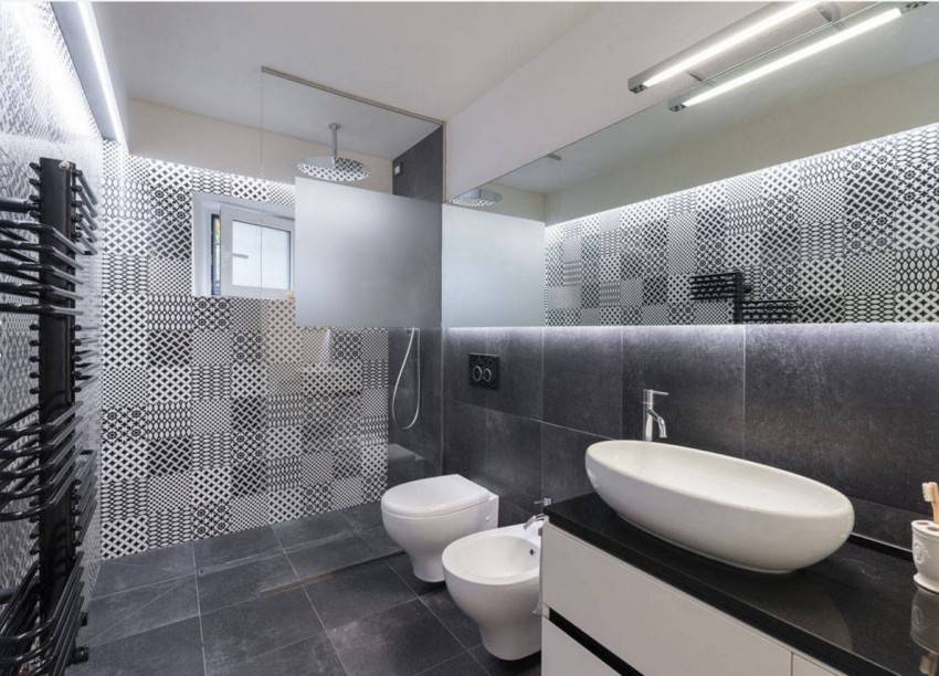Это могут быть белые стены в сочетании с черным полом. Комната приобретает строгие очертания, стильности добавляет сантехника белого цвета, а солидности — структура материала под «камень». Отделку стен и пола можно произвести следующим образом: вкраплением в белое полотно одиночных черных элементов, либо размещением симметричных черных линий или композиций.