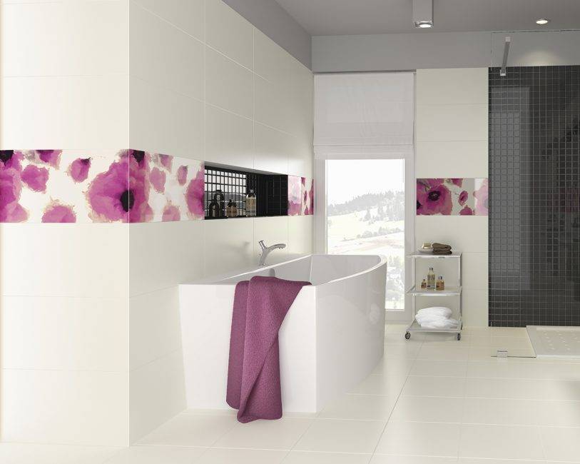 Неплохой эффект дает оформление нижней части стены черным кафелем, а верхней части — белым, с разделением декоративным фризом. И очень экстравагантно выглядит сочетание белых стен с черным потолком и полом. Прекрасным дополнением будет встроенное в стену зеркало, а также наличие аксессуаров в виде мыльниц и подставок для зубных щеток черного или серебристо-ртутного, под зеркало, цвета.
