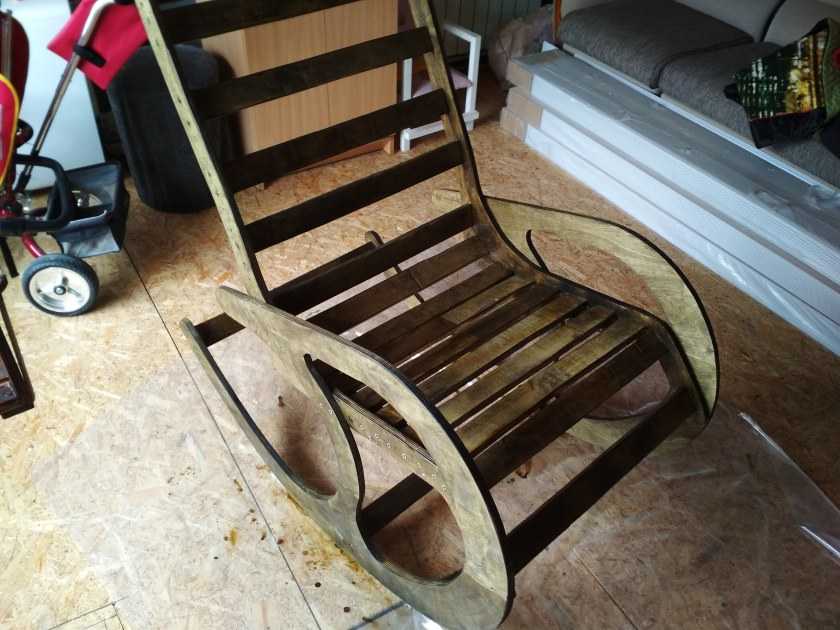 Практика усиления этих элементов прочными деревянными накладками особенно актуальна для старых рассохшихся изделий или новых гнутоклееных конструкций, изготавливаемых из фанеры своими руками. Для закрепления используются шканты, скрываемые внутри мебели. При правильном подходе деревянная качалка покрывается защитными и ЛКС составами несколько раз (как минимум 1 из них — в полностью собранном виде).