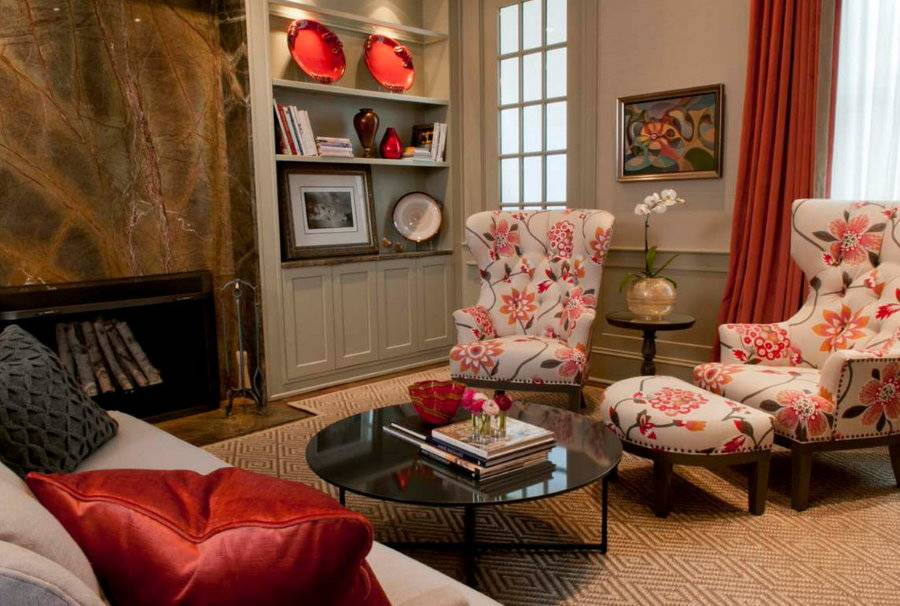 - В гостиной будут мило смотреться и винтажные кресла, украшенные принтованной обивкой. Узор из мелких цветочков или тонкая полоска украсит мебель. Главное, чтобы такое цветастое кресло гармонировало с общим интерьером помещения.
