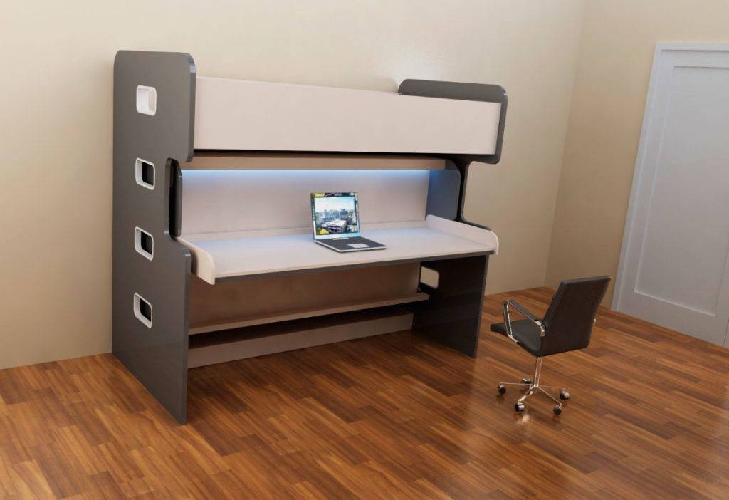 - Кровать-стол трансформер. Может быть в двух вариантах: стационарное ложе наверху + складной столик внизу или выдвижная постель, скрывающая стол в корпусе.