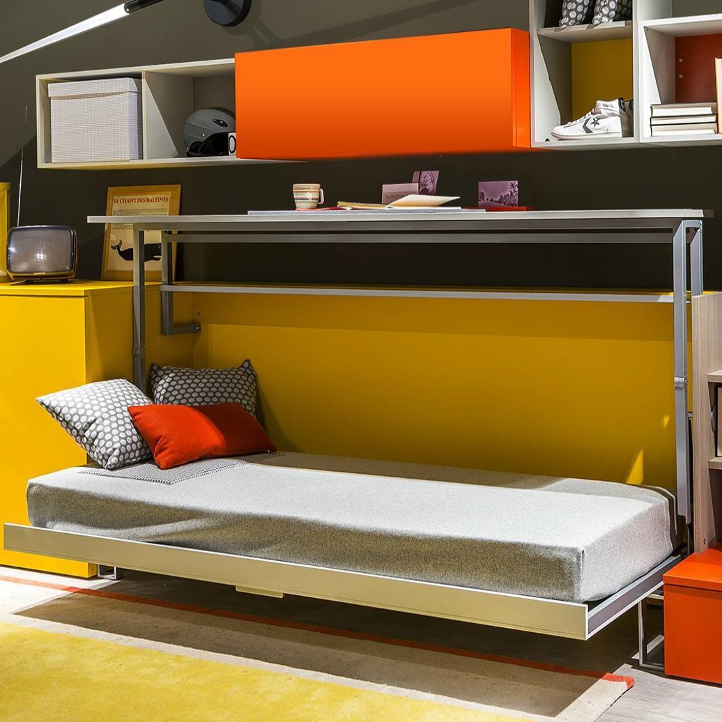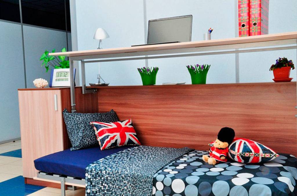 - «стол-вниз»: в этом случае кровать расположена прямо под столешницей. Чтобы разложить спальное место, стол поднимают вверх, а днем его наоборот опускают.