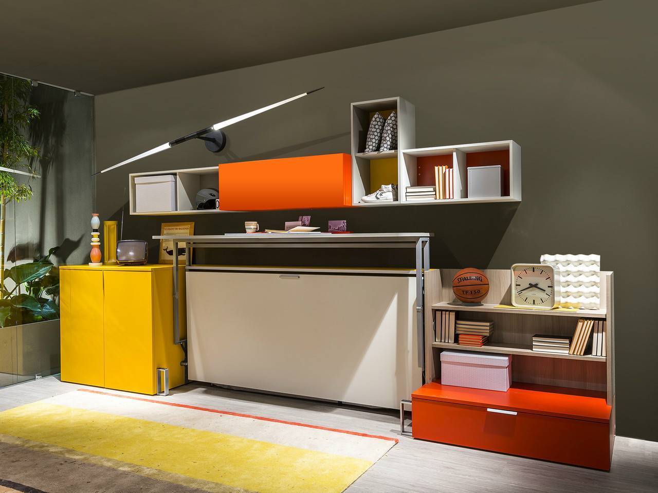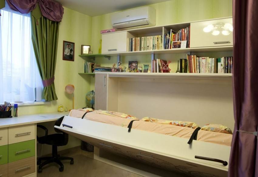 Дизайн небольшой яркой детской комнаты с встроенной откидной кроватью