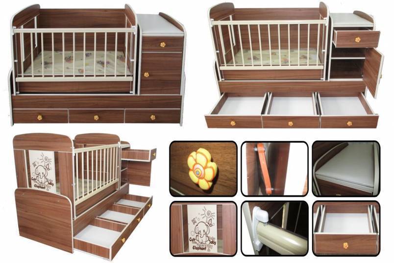 Многофункциональность моделей позволяет отказаться от покупки дополнительной мебели и сэкономить не малые деньги. Используя специальные крепежи и дополнительные элементы помимо кроватки можно собрать манеж, пеленальный столик, комод.