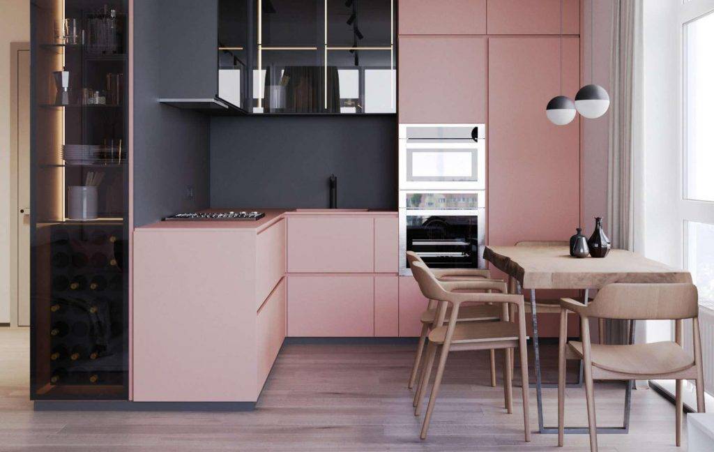 С розовым. Нежный розовый – хороший компаньон для баклажанового. Такая кухня выйдет уникальной, так как не каждый решится сделать такой ход у себя дома. Осмелившимся на него повезет – они получат индивидуальный интерьер, который только украсит кухонное пространство.