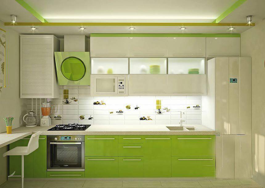 Обычно применяется два тона для неяркой основы (белоснежный, угольный, древесный, бежевый, белоснежный), и один для акцента (красный, зеленый, желтый, оранжевый, голубой). Например, кухни цвета кофе с молоком, черного, белого, серого, коричневого можно разбавить ярким фартуком или столешницей.