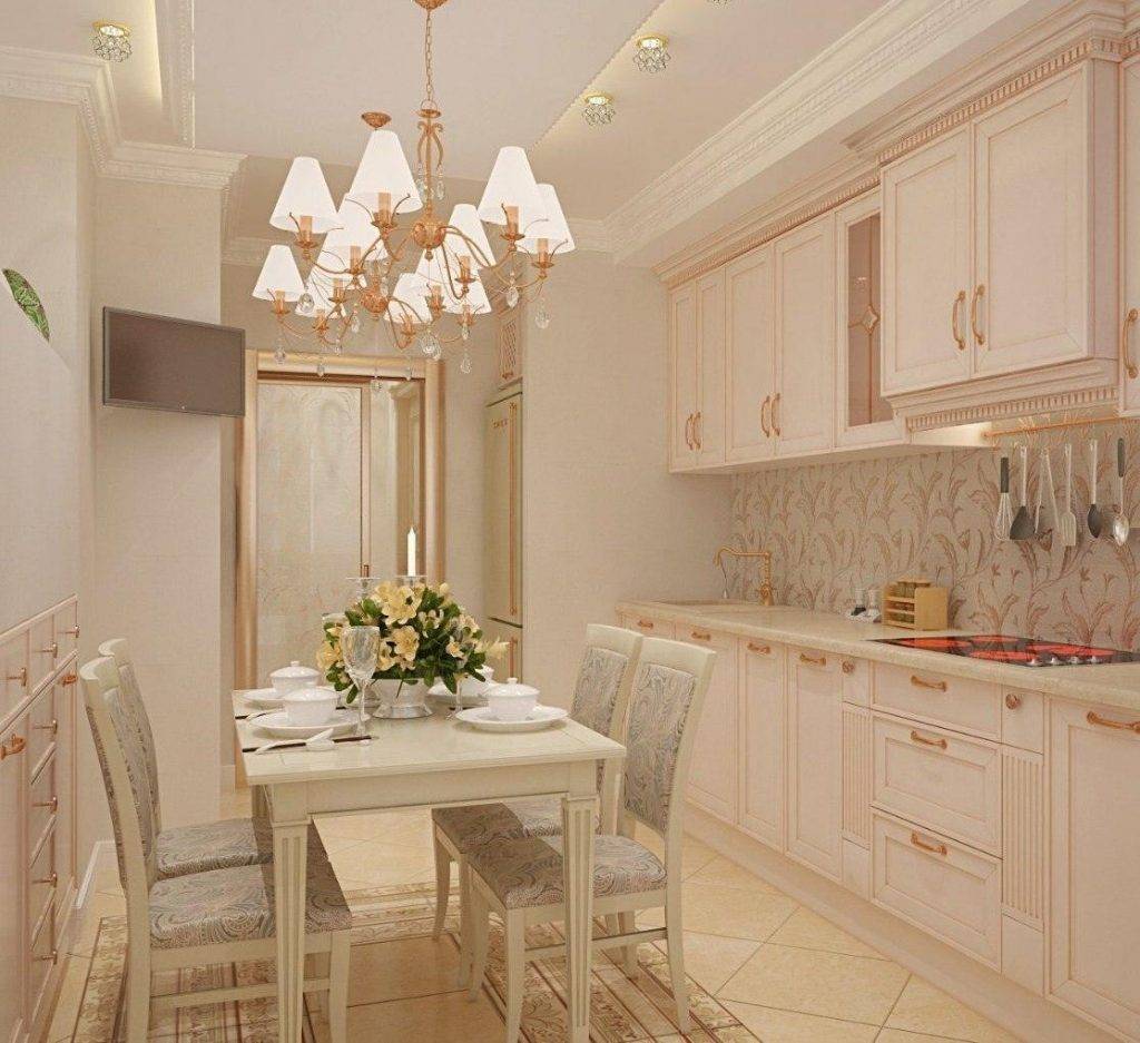 Это универсальный стиль, который никогда не выходит из моды. Он предполагает наличие белых, бежевых, коричневых цветов. Как правило, в кухнях, оформленных в классическом стиле, белый потолок, бежевые или светло-кофейные стены, светлый пол. В этот дизайн идеально впишется мебель из массива венге. Мебельные гарнитуры лишены вычурности, они практичны, удобны. Для каждой вещи предусмотрено здесь своё место. Классический дизайн смотрится дорого и солидно, однако кухня для него не может быть маленькой. На небольшой 6-метровой кухне такой набор мебели будет выглядеть громоздко.
