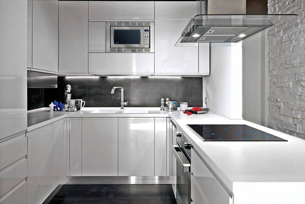 Кухонные угловые гарнитуры устанавливают в просторных домах. Прямую планировку Хай-Тек использует в маленьких пространствах. Мебель должна быть симметрична.