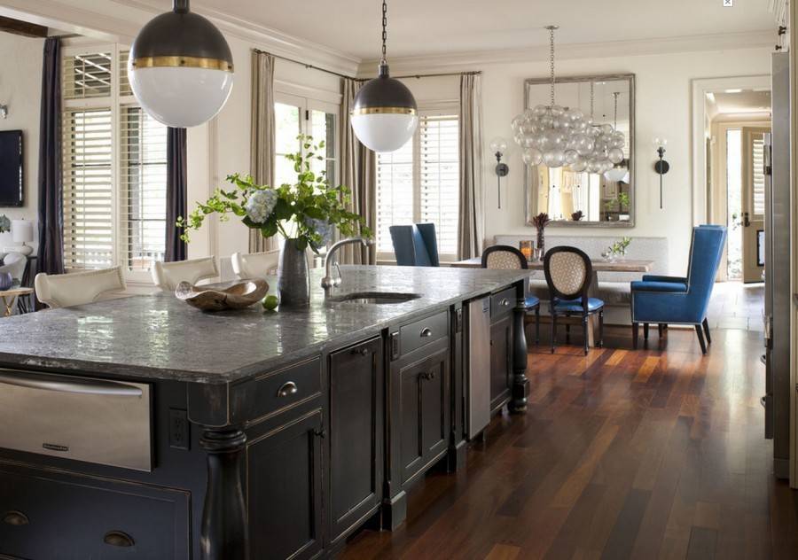Зрительно отделить зону отдыха от кухни можно, оформив столовую в качестве переходного пространства, поставив диван спинкой к кухне или стеллаж. Хороший способ разделить зоны — использовать разные материалы для отделки. Для кухни выбираются более износостойкие материалы, например, кафельная плитка или камень, а для гостиной хорошо подходят ковролин, ламинат, линолеум или паркет.