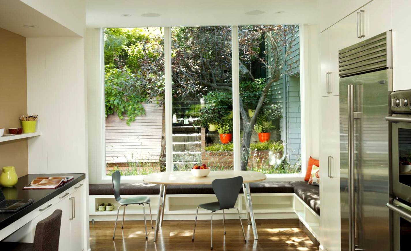 За счет утепленного балкона или лоджии нередко увеличивают помещение кухни. При сносе балконной двери и окна остается часть несущей стены, которую нельзя сносить. К ней дизайнеры рекомендуют устанавливать диванчик с низкой спинкой, не закрывающей естественный свет. Подобным образом мягкую мебель устанавливают возле окна. Диван также устанавливают напротив удлиненного подоконника, выполняющего роль стола.