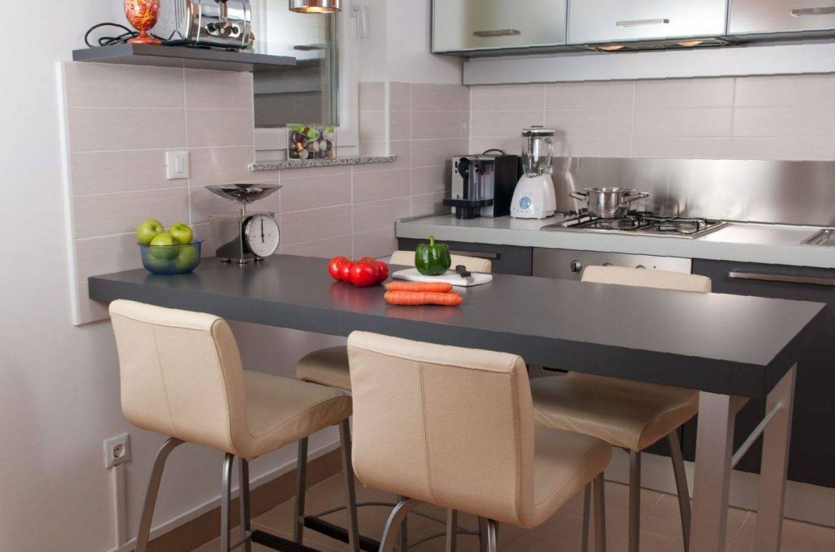 Среди других распространенных конструкций выделим барную стойку, которую монтируют на место бывшего подоконника и многоуровневую. Со стороны рабочей зоны ее делают на уровне столешницы, а с жилой — ступенькой поднимается до стандартной высоты.